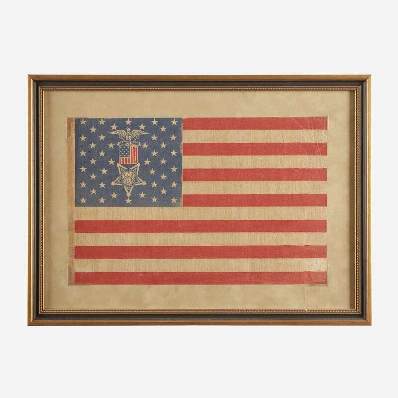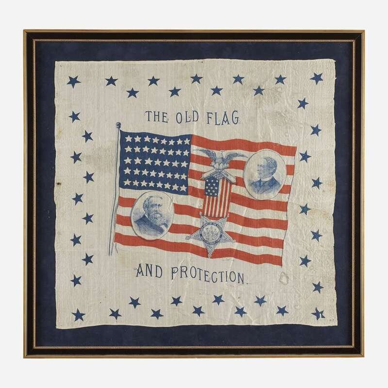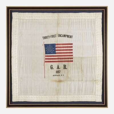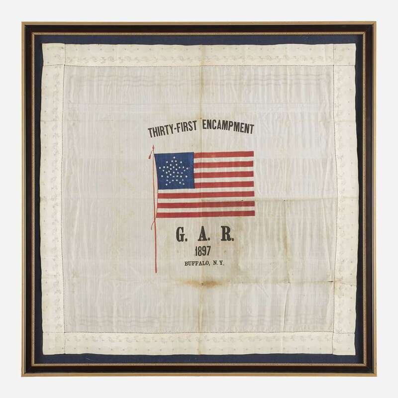 The first, a printed silk hankerchief with a 39-Star American Flag inscribed, "The Old Flag and Protection" with portrait medallions of Benjamin Harrison & Levi P. Morton and G.A.R. badge, the second, a silk handkerchief with 38-Star American Flag in the "Great Star" pattern inscribed, "Thirty-First Encampment/ G.A.R./ 1897/ Buffalo, N.Y.," and a printed 44-Star parade Flag having a G.A.R. badge printed on canton, all framed.