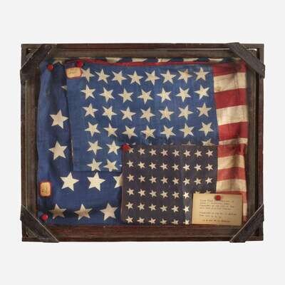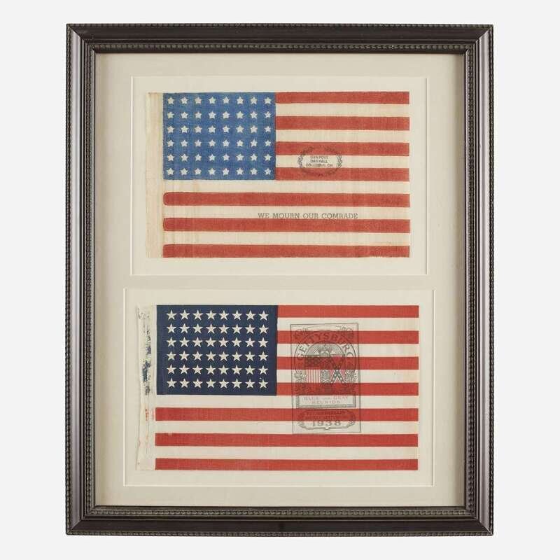 Printed on cotton, the first bearing stamp, "GAR POST/Dan Hall/ Columbus, Ohio" and "We Mourn Our Comrade," the second, bearing stamp, "Gettysburg/ Blue and Gray/ Reunion/ 75th Anniversary/ Battle of Gettysburg/1938," together with three printed cotton American Flags, 44-Star, 46-Star and a 48-Star, folded and framed with a typed note, "These flags are keepsakes of/James M. MacKenzie, Past /Commander of the John E. /Russell Post, G.A.R. of Boston./ Presented to the Wm. F. Dalton/Post 137, A.L. by/Mr. and Mrs. Harry Edwards."