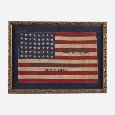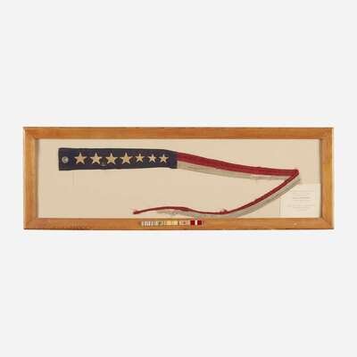 The parade Flags printed, "Buy Bonds Support Your Country" and "Keep em Flying! Remember Pearl Harbor Dec. 7, 1941," and a commissioning pennant with cotton machine-sewn stars on wool bunting framed with an invitation," The Commanding Officer, Officers and Crew/request lthe honor of your presence/at the Commissioning of the/ U.S.S. Gulfport/ at West Pier, Gulfport, Mississippi/ on / Saturday 16 September/nineteen hundres and forty-four/ at 10:00, all framed.