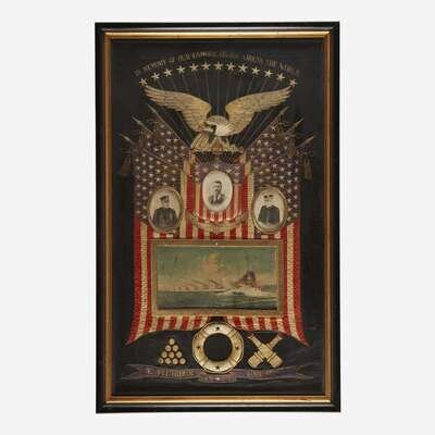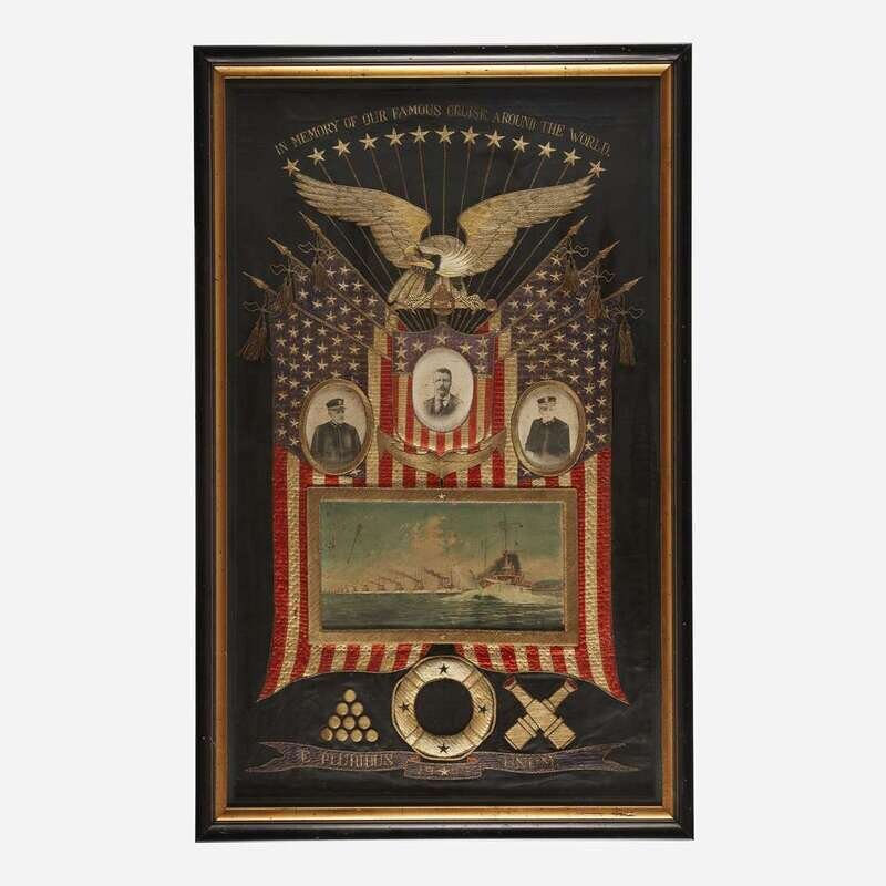 "In Memory of Our Famous Cruise Around the World" silk floss and metallic threads worked with American eagle and panoply of American Flags over portraits of Theodore Roosevelt, Admirals and polychrome view of the Great White Fleet, marine accoutrements below, framed.