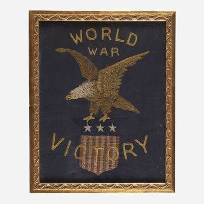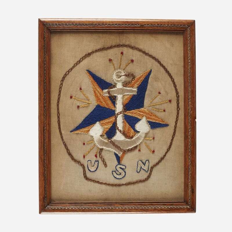 "World War Victory" over American eagle and shield, and "USN" below a fouled anchor and compass star, framed.