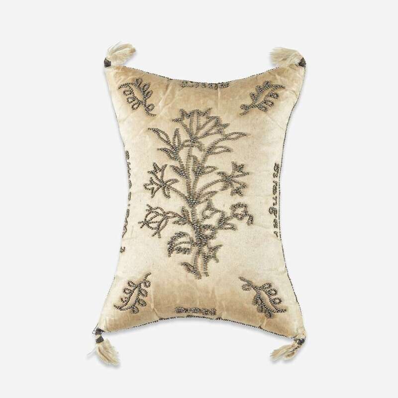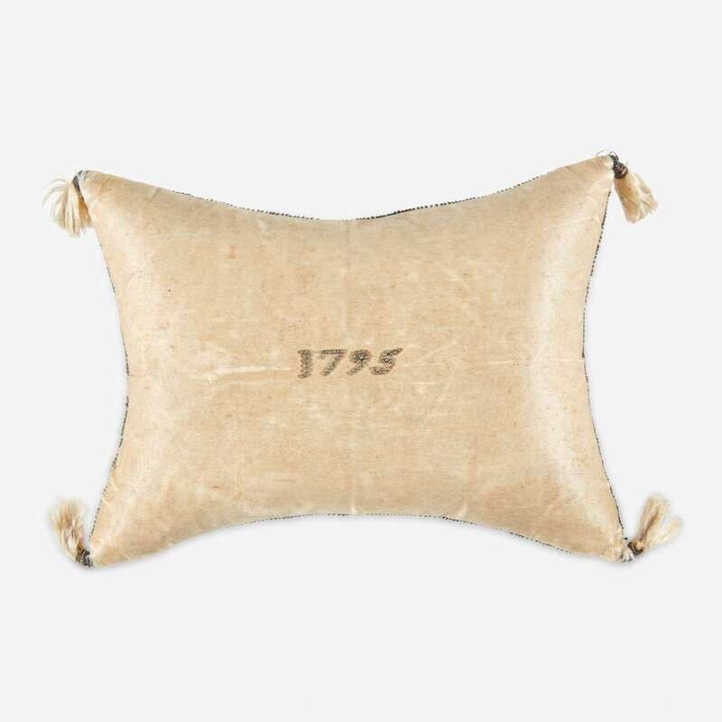 A pin-decorated "Welcome Little Stranger Here" silk pillow Possibly New York, dated, "1795"
