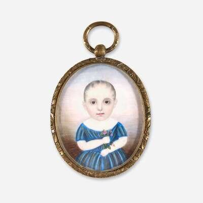 Mrs. Moses B. Russell (Clarissa Peters, 1809-1854) Portrait miniature of a young child in blue holding a rose