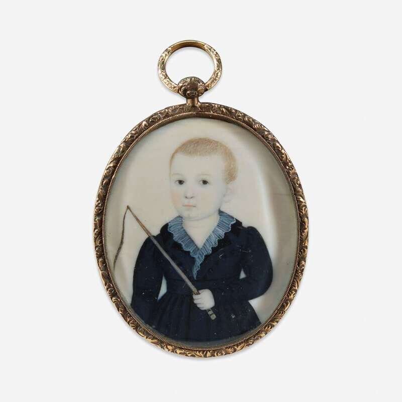American School 19th century Portrait miniature of a little blond boy holding a whip