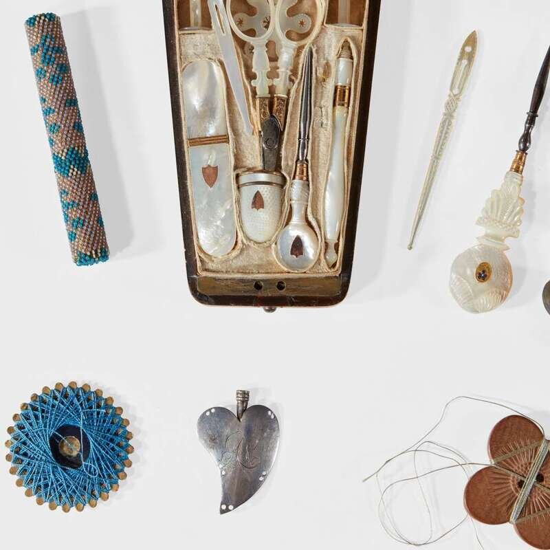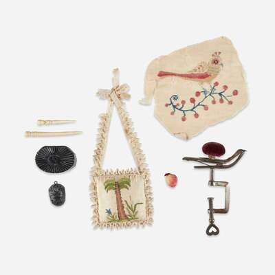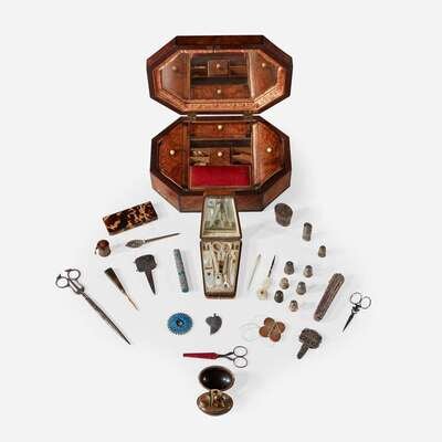 Including an octagonal figured satinwood and ebony sewing box fitted with compartments and some sewing items; a small trapezoidal burl sewing kit fitted with mother-of pearl accoutrements; a tortoise shell needle case; a melon-shaped carved ebony sewing kit; six silver thimbles; a pair of engraved steel scissors; an engraved steel scissors case with scissors; steel scissors marked "Hersault" with leather sleeve; a collection of silver filagree work items: scissors case with scissors, etuit, perfume case with two bottles, small case with matching thimble; a beaded needlecase; three bodkins of mother-of-pearl, steel and tortoise; assorted thread holders; a leaf-shaped chatelaine needlecase; embroidered silk hanging pin cushion, sewing bird, small laquer box, wax strawberries, and a tartanware measuring tape.