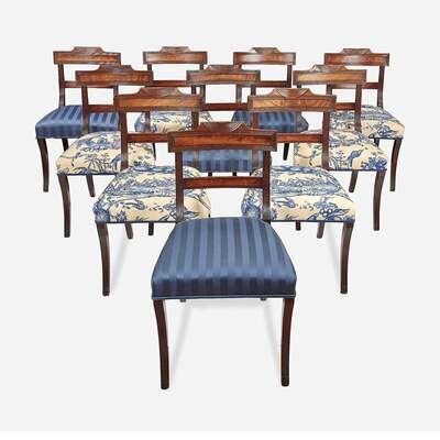 Set of ten Classical carved and inlaid mahogany side chairs circa 1820