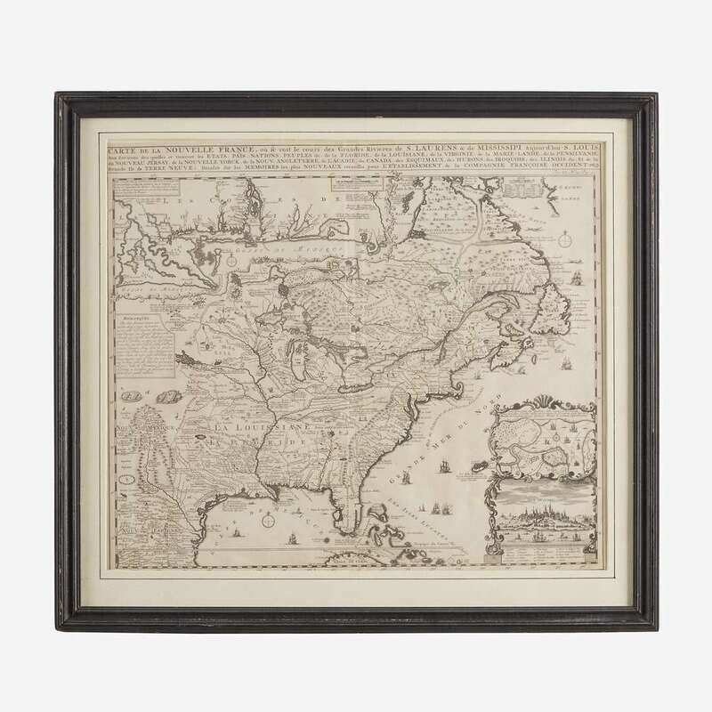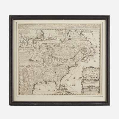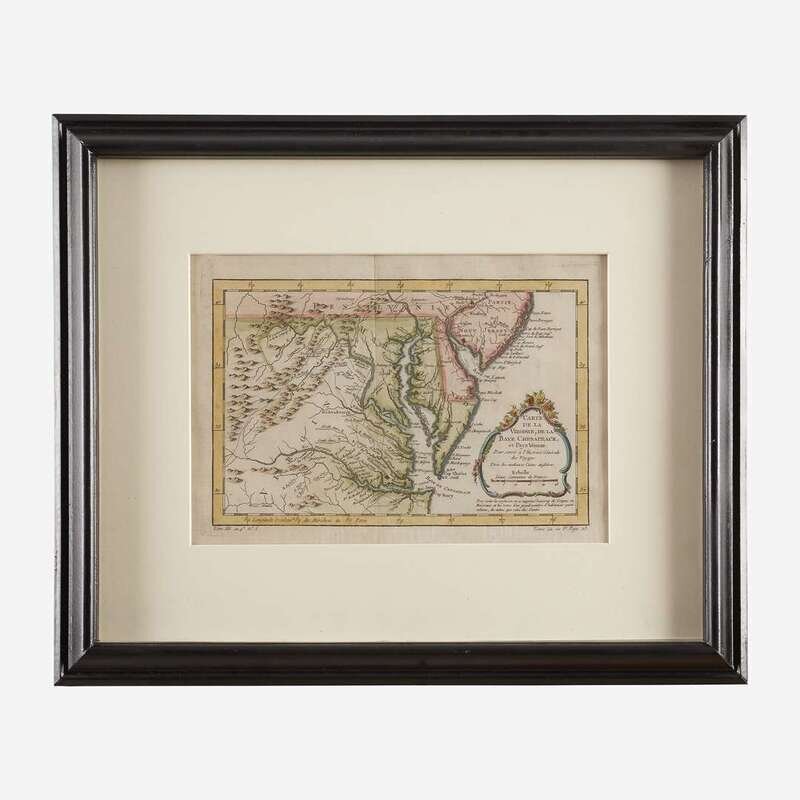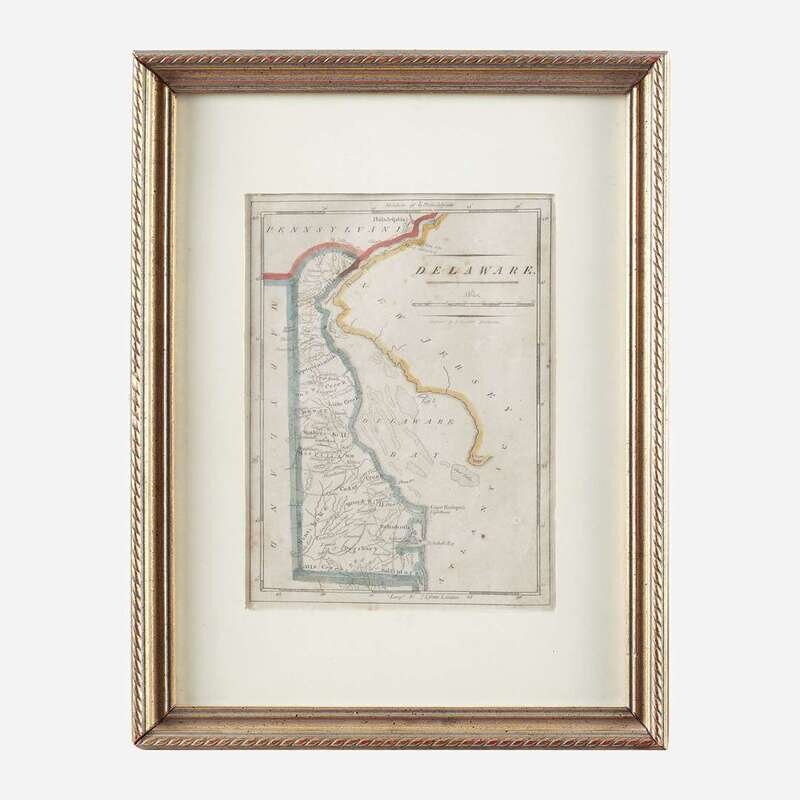 Comprising a French hand-colored copperplate map of Virginia, 1760-1762; a map of the United States, 1719, by H.A. Chatelain, Amsterdam; and a map of Delaware, 1801 Edition, from Carey's American Pocket Atlas, engraved by Amos Doolittle of New Haven, Connecticut (originally 1795); all matted and framed.
