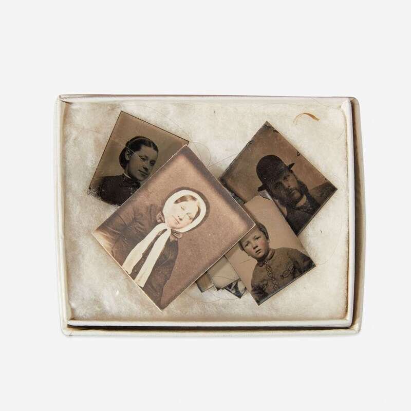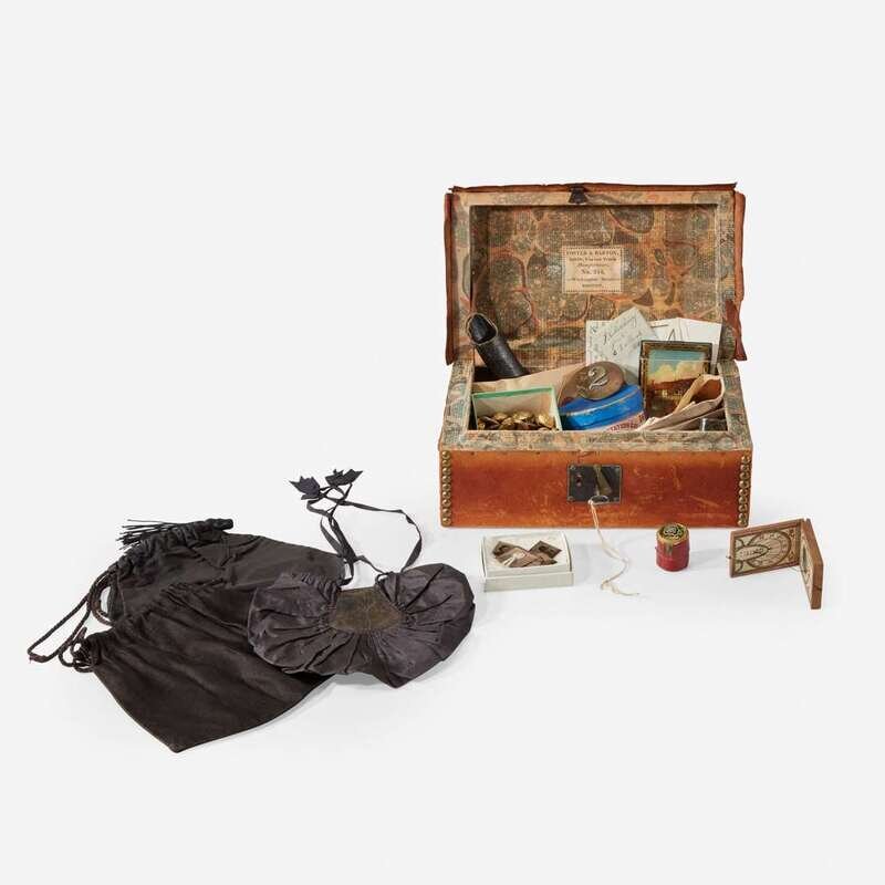 The box bearing the printed label, "Foster & Barton...Manufacturers No. 213, Washington Street Boston," accompanied by note, "Great Grandmother A.J. Phillips small trunk and mourning bags," includes a number of "bits" of identified family hair; two printed menus; carte de visites and ferrotype of Mrs. Anna Jones Phillips late in life; a mourning ring for Mrs. Phillips in box; a box of "imitation collars"; a small box of tiny tintypes; mourning stationery; a box with a horse shoe charm; a receipt for a Chickering Piano,1846; G.A.R. reunion ribbons and brass buttons; folding spectacles in a leather case; seven brass Cavalry military buttons with mark of D. Evans & Co.; two brass military rosettes for horse halter; a group of military coat buttons from the Spanish-American War, Attleboro; a collection of Naval buttons marked Waterbury Button Co.; a small Ambrotype of a young girl identified as Alice Elizabeth Tregren (1847-1926), Manchester, N.H; and a small Ambrotype of a young man identified as Augustus Baker Pierce (1840-1919), "shortly before he sailed for China in the Oriental in 1859"; and three black mourning reticules.