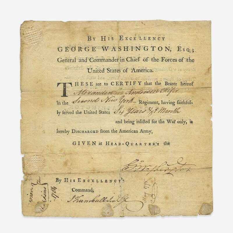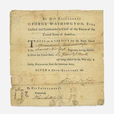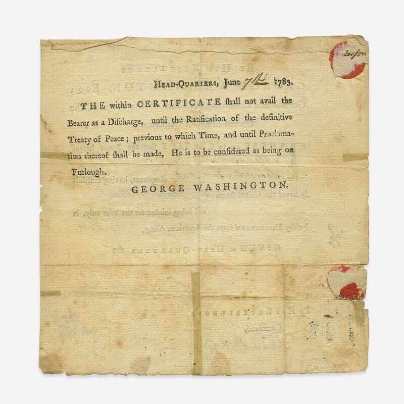 (Newburgh, New York): Head-quarter's, June 7, 1783. Partially printed military discharge, 8 1/4 x 8 in. (209 x 203 mm). Signed by Washington ("Go. Washington"), as Commander in Chief of the Continental Army, discharging Alexander Anderson of the Second New York Regiment of the American Army, and countersigned by his aide-de-camp John Trumbull, Jr. Lacking Badge of Merit portion; chipping and small closed tears along edges; scattered soiling; tape repairs at folds on verso. Lot includes a postcard of Washington.