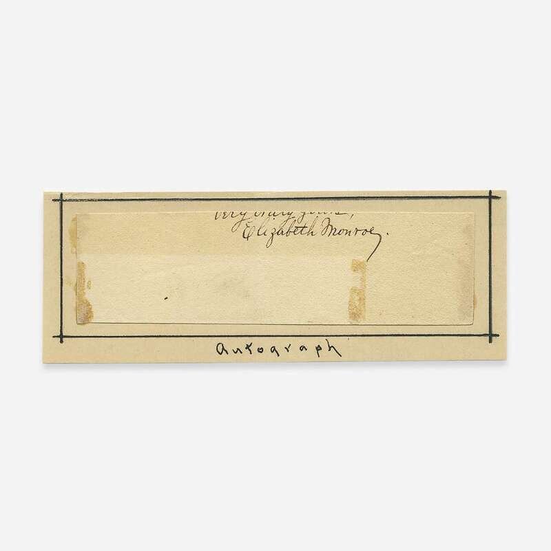 No place, no date. Cut signature, signed by First Lady Elizabeth Monroe; excised from a letter and mounted to card. 1 3/4 x 4 7/8 in. (44 x 123 mm). Lot includes postcard portrait of James Monroe. Very rare, few examples of her signature exist.