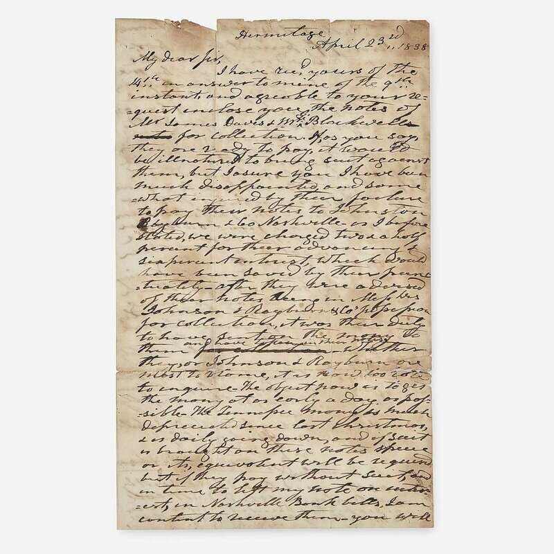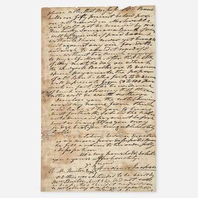 Hermitage, (Tennessee), April 23, 1838. 2 pp. on one sheet. 12 1/4 x 7 5/8 in. (311 x 193 mm). Autograph letter, signed and initialed by Jackson to lawyer R(obert). M(inns). Burton. Creasing from original folds, scattered separations along same; scattered soiling; chipping in top edge affecting a few words; bottom horizontal fold repaired in two places. Lot includes an engraved portrait of Jackson.