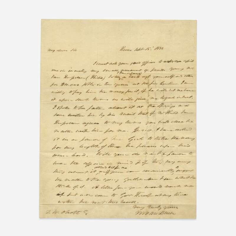 Rome, (New York), September 15, 1832. 4to. 1 p. on one sheet folded to make four pages. 9 7/8 x 7 3/4 in. (250 x 196 mm). Autograph letter, signed by Van Buren to Thomas W. Olcott. Creasing from original folds, one inch separation along top horizontal fold on pp. 1/2, and a three inch separation on same fold on pp. 3/4. Lot includes a postcard portrait of Van Buren.