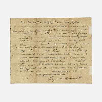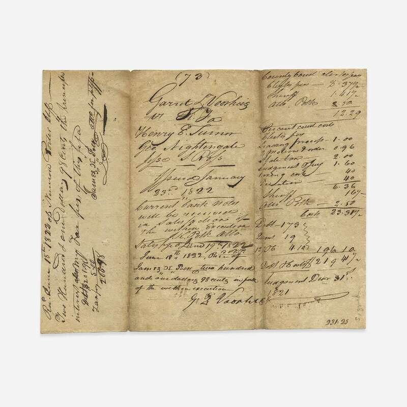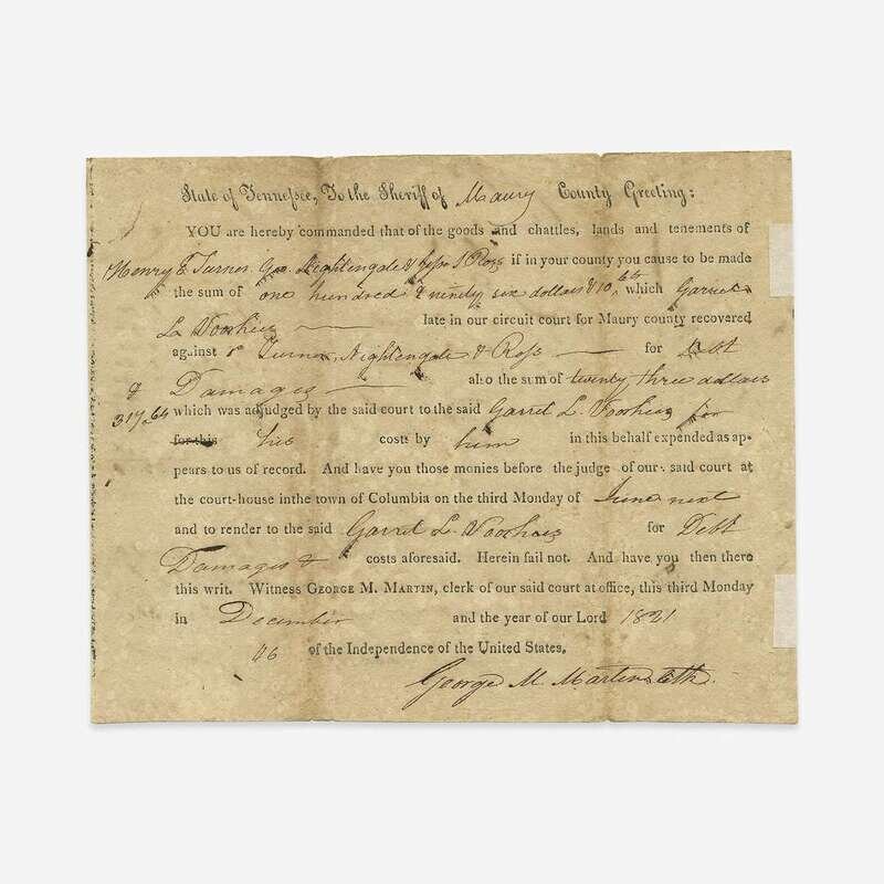 Maury County, Tennessee, June 18, 1822. 6 1/4 x 7 3/4 in. (158 x 196 mm). Partially printed court document, signed on verso by Polk ("James K. Polk Atty for Pltff"), recording that he received from Sheriff Nimrod Porter the sum of $206.98, for "the principle interest, also my tax fees.", additional transactions recorded on same. Creasing from original folds; tape remnants from old mount on right side recto. Lot includes an engraved portrait of Polk.