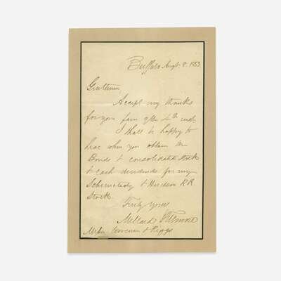 Buffalo, (New York), August 8, 1853. 1 p. 6 3/4 x 4 1/8 in. (171 x 104 mm). Autograph letter, signed on mourning stationery, by Fillmore to bankers Corcoran & Riggs (First Lady Abigail Fillmore had died only five months earlier). Mounted on card; creasing from original folds. Lot includes an engraved portrait of Fillmore.