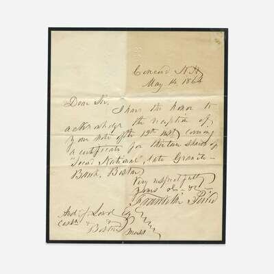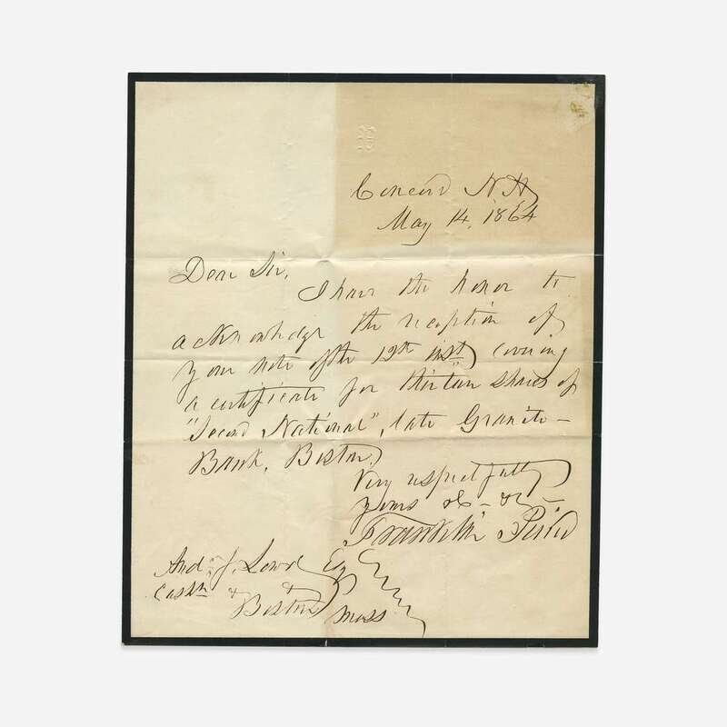 Concord, N.(ew) H.(ampshire), May 14, 1864. 1 p. on one sheet folded to make four pages. 8 3/4 x 7 1/4 in. (222 x 184 mm). Autograph letter, signed by Pierce, to his banker And(rew). J. Lowd; on mourning stationery (former First Lady Jane Pierce had died only five months earlier); embossed intial "P" at top; creasing from original folds; tape remnants on verso from old mount.