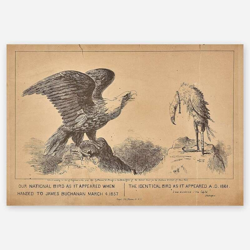 New York: Thomas W. Strong, 1861. Engraved cartoon by (Michael Angelo) Woolf with the caption: "Our National Bird as it Appeared When Handed to James Buchanan March 4 1857, the Identical Bird as it Appeared A.D. 1861." Evenly toned; three short closed tears, and one 2 in. closed tear, along top edge; vertical crease traversing right side. 10 x 14 3/4 in. (254 x 374 mm).