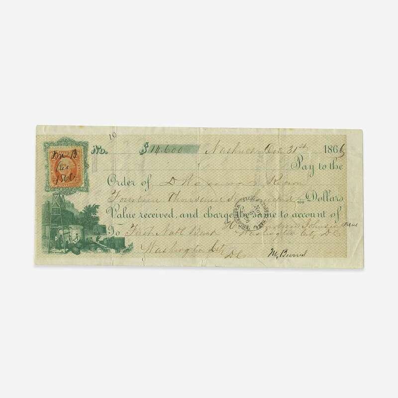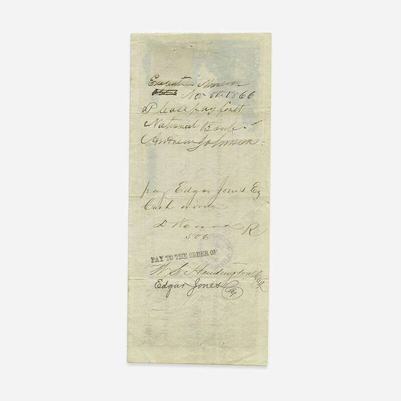 Washington, D.C., October 31, 1866. 3 3/8 x 8 in. (85 x 203 mm). Partially printed check, from Tennessee businessman and politican Michael Burns to Dempsey Weaver, Vice President of the Third National Bank of Nashville, drawn on the First National Bank of Washington, D.C. for $14,600, and endorsed by Johnson on verso: "Executive Mansion/Nov 5th 1866/Please pay first National Bank/Andrew Johnson." Tax stamp in top left; vignette at bottom left; cancellation cut at right; bank stamp dated November 5th at same. Creasing from old folds. Lot includes an engraved portrait of Johnson.