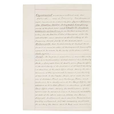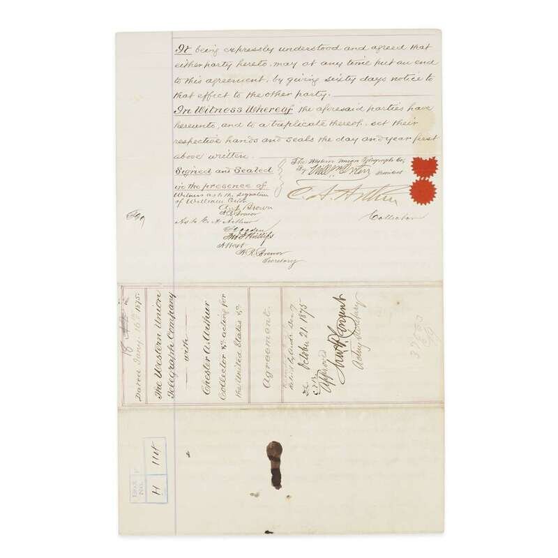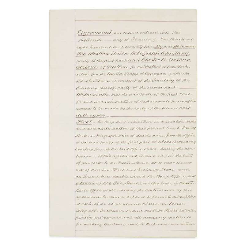 New York, January 16, 1875. 4 pp. on two sheets of lined paper. 12 1/2 x 8 in. (317 x 203 mm). Manuscript document, signed by Arthur, William Orton, and A.R. Brewer, stating the agreement between the United States, represented by Chester A. Arthur, Collector of Customs for the District of New York, and the Western Union Telegraph Company to maintain their telegraph lines and keep them supplied with necessary equipment, for which Western Union would be paid $1,500 per annum; neat tape repairs to center folds.