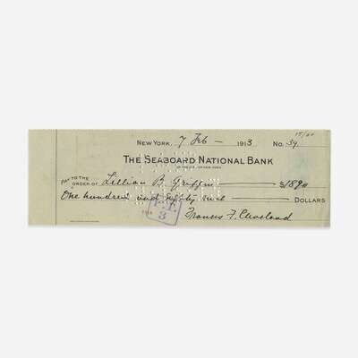 New York, February 7, 1913. 2 3/4 x 8 5/8 in. (69 x 219 mm). Partially printed Seaboard National Bank check, signed by First Lady Frances F. Cleveland, and payable to Lillian B. Griffin, for $189. Endorsed by Griffin on verso; perforated and with ink cancellation stamp at center. Lot includes a color trade card with an image of Cleveland.