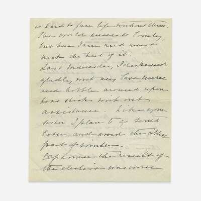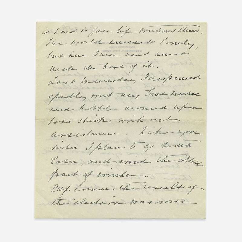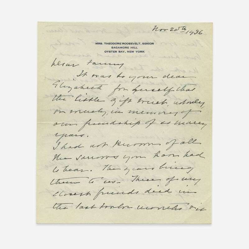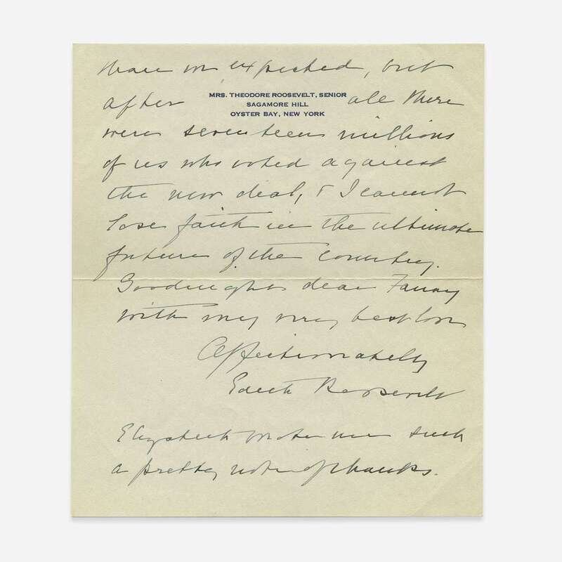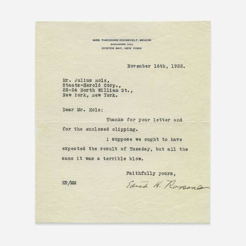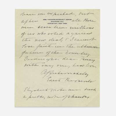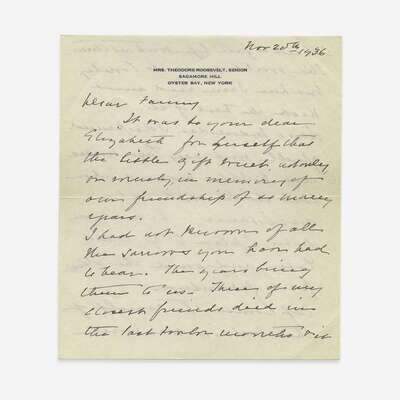 Typed Letter, signed Oyster Bay, New York, November 16th, 1932. 1 p. 7 x 6 in. (177 x 152 mm). Typed letter, signed by First Lady Edith Roosevelt, to Mr. Julius Holz candidly expressing her dismay at the defeat of Herbert Hoover to Franklin Delano Roosevelt the previous Tuesday (November 8): "I suppose we ought to have expected the result of Tuesday, but all the same it was a terrible blow." On Sagamore Hill stationery; creasing from original fold. Together with: Autograph Letter, signed Oyster Bay, New York, Nov(ember) 20th, 1936. 3 pp. on two sheets. 7 x 6 in. (177 x 152 mm). Intimate autograph letter, signed by Roosevelt, to longtime friend Fanny Smith Parsons: "I had not known of all the sorrows you have had to bear. The years bring these to us. Three of my closest friends died in the last seven months & it is hard to face life with out them..." She goes on to write, "...the result of the election was more than we expected but after all there were seventeen millions of us who worked against the new deal, & I cannot lose faith in the ultimate future of the country." On Sagamore Hill stationery; creasing from original folds. Lot includes a postcard depicting the Roosevelt family.