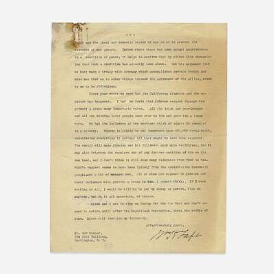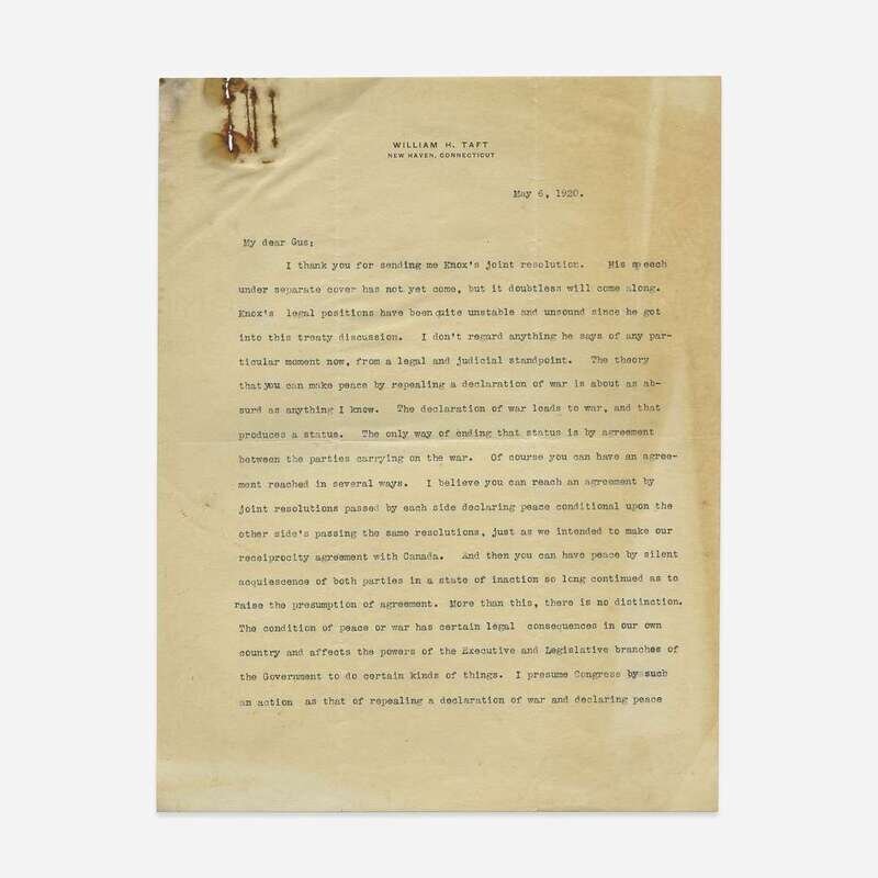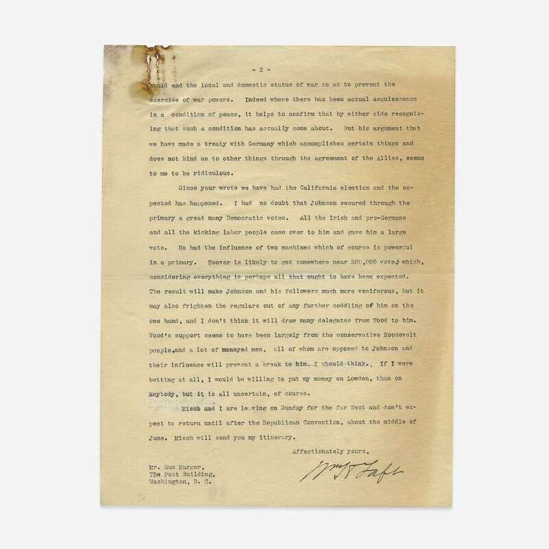 New Haven, Connecticut, May 6, 1920. 2 pp. 10 1/2 x 8 in. (266 x 203 mm). Extraordinary typed letter, signed by Taft, to Republican Press Director Gus J. Karger; on Taft's personal stationery. Creasing from original folds; top left corner of each leaf damp wrinkled, residue and loss from two paperclips on recto and verso of same; unevenly toned.