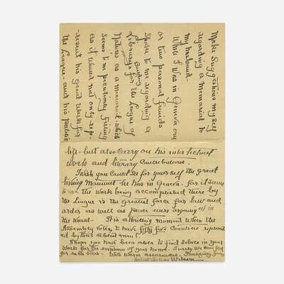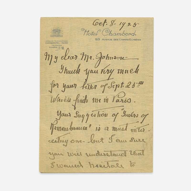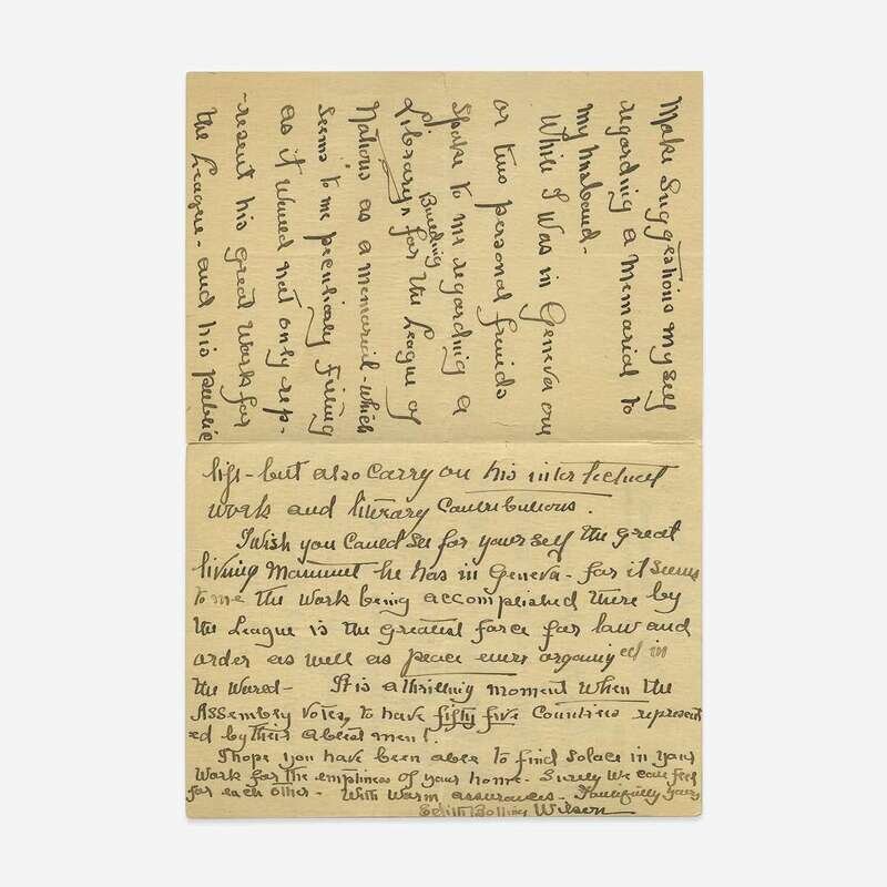 Paris, October 8, 1925. 3 pp. on one sheet folded to make four pages. 7 3/8 x 5 5/16 in. (187 x 134 mm). Autograph letter, signed by First Lady Edith Bolling Wilson, to a Mr. Johnson, regarding a memorial for her late husband, twenty-eighth president Woodrow Wilson, who died the previous year. On Hotel Chambord stationery; creasing from original folds. Lot includes a signed portrait of Edith Wilson.