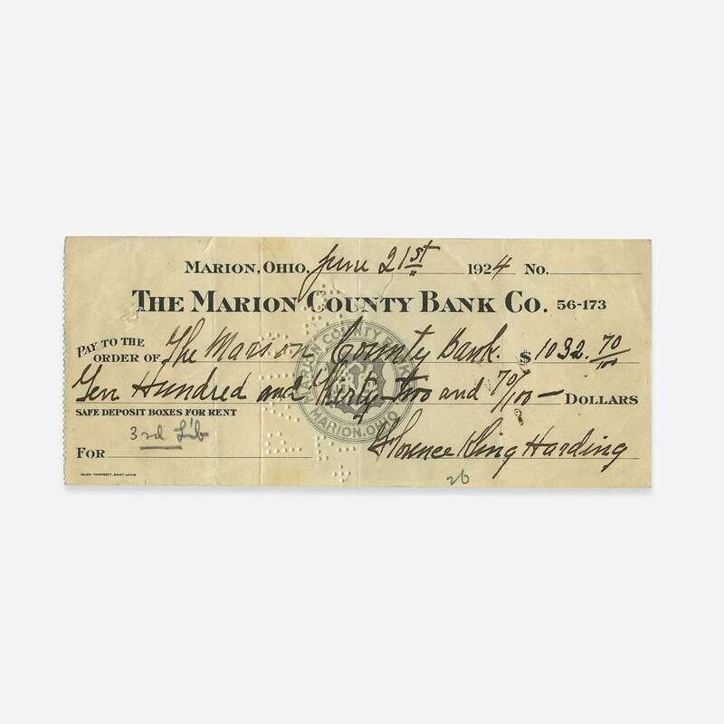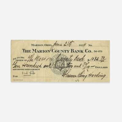 Marion, Ohio, June 21, 1924. 2 5/8 x 6 1/4 in. (66 x 158 mm). Partially printed Marion County Bank Co. check, signed by First Lady Florence Harding, in the amount of $1,032. 70. Perforated "Paid" stamp at center; creasing from original folds. Lot includes a postcard depicting Florence and her husband, Warren G. Harding.