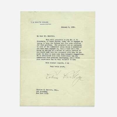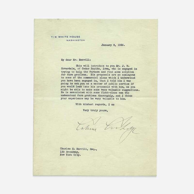 Washington, D.C., January 8, 1926. 1 p. on one sheet folded to make four pages. 8 7/8 x 7 in. (225 x 177 mm). Typed letter, signed by Coolidge, to legendary stockbroker Charles E. Merrill. On White House stationery; creasing from original fold; paper residue on verso from previous mount. Lot includes a Coolidge related postcard.
