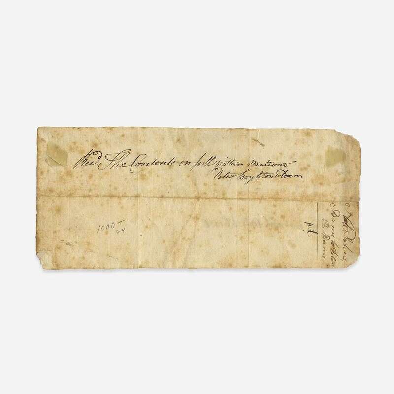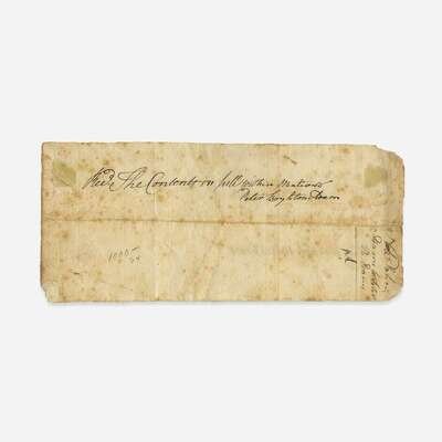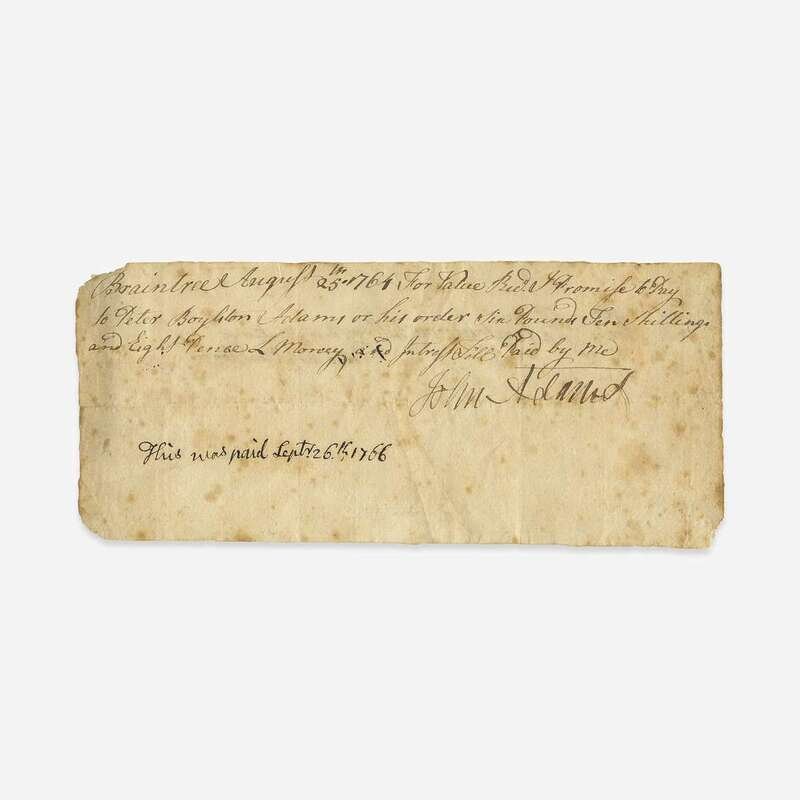 Braintree, (Massachusetts), August 25, 1764. 3 3/8 x 7 5/8 in. (85 x 193 mm). Promissory note, in a secreterial hand, promising to pay Peter Boylston Adams, younger brother of future second president John Adams, the sum of ten shillings and eight pence. Annotated by John Adams at bottom: "This was paid Sept 26th 1766", also annotated by Peter on verso. Creased along center from original fold; scattered spotting. Lot includes an engraved portrait of Adams.