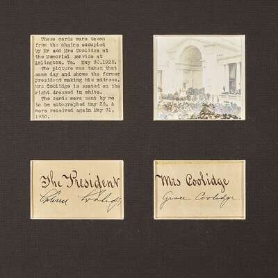 No place, no date. Cut signatures of Calvin and Grace Coolidge, signed later on their original place cards from the Memorial Day service at Arlington National Cemetery on May 30, 1925. In mat together with an original photo taken at the event, as well as a typed note from the previous owner: "These cards were taken from the chairs occupied by Mr and Mrs Coolidge at the Memorial Serice at Arlington, Va. May 30, 1925. The picture was taken that same day and shows the former President making his address, Mrs Coolidge is seated on the right dressed in white. The cards were sent by me to be autographed May 28, & were received again May 31, 1930." Each signature approximately 1 3/4 x 2 3/4 in. (44 x 69 mm).