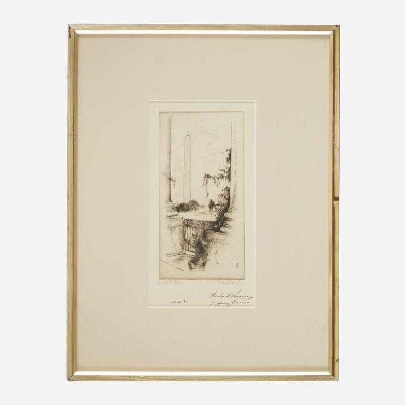 Original etching by Joseph Conover Claghorn. Signed by President Herbert Hoover and First Lady Lou Henry Hoover, and dated 12-25-'31. Signed and titled "From the South Portico of the White House", by Claghorn below image. Print: 9 1/2 x 5 in. (241 x 127 mm) (sight); frame: 16 3/4 x 12 3/4 in. (425 x 323 mm). Unexamined out of frame.