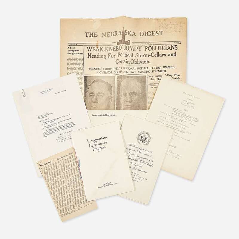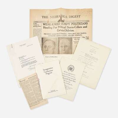 (Washington, D.C.), March 4, 1933. 8vo. Printed invitation and program from FDR's first inauguration; with original envelope. Lot includes five other pieces of FDR-related ephemera, also related to his first term, including a typed letter to then Governor Roosevelt from J.N. Norton regarding his candidacy, and with a typed reponse from Roosevelt's secretary; a 1932 typed itinerary for a visit Roosevelt made to Omaha, Nebraska and Sioux City, Iowa; as well as one newspaper clipping and one partial newspaper. Condition varies.