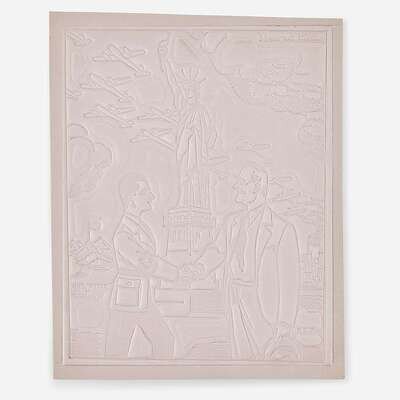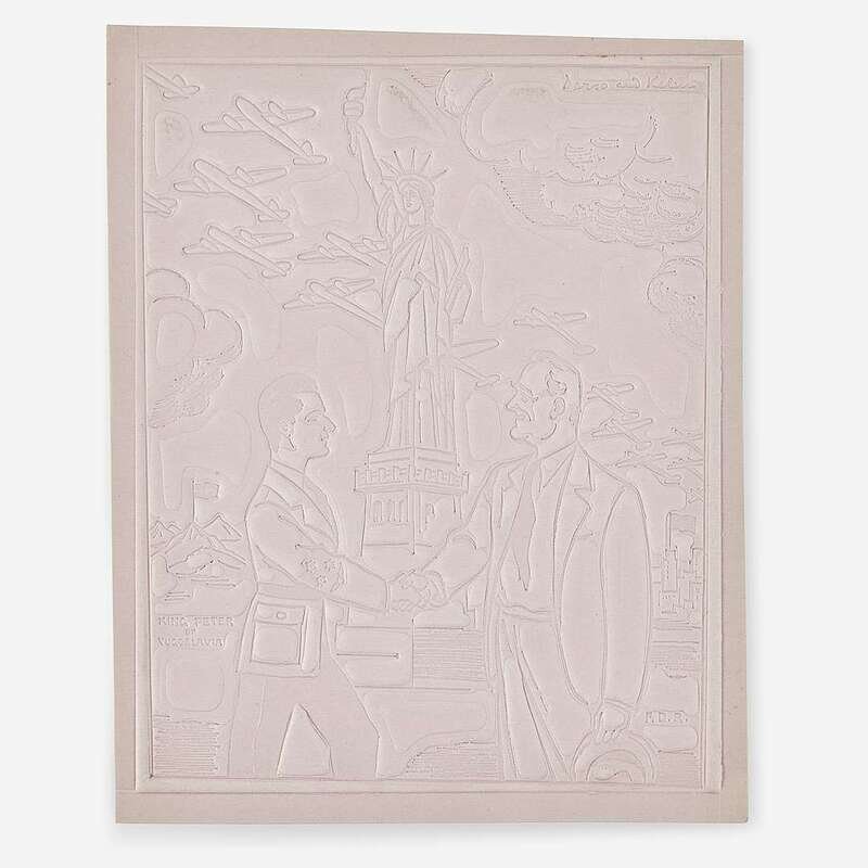 No place, no date (New York, ca. 1942). Rare relief printing proof on heavy pink card, depicting a Derso & Kelen caricature of Roosevelt greeting an exiled King Peter of Yugoslavia in front of the Statue of Liberty during WWII. "Certified" ink stamps on verso. 8 1/4 x 7 in. (209 x 177 mm).