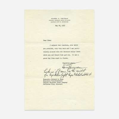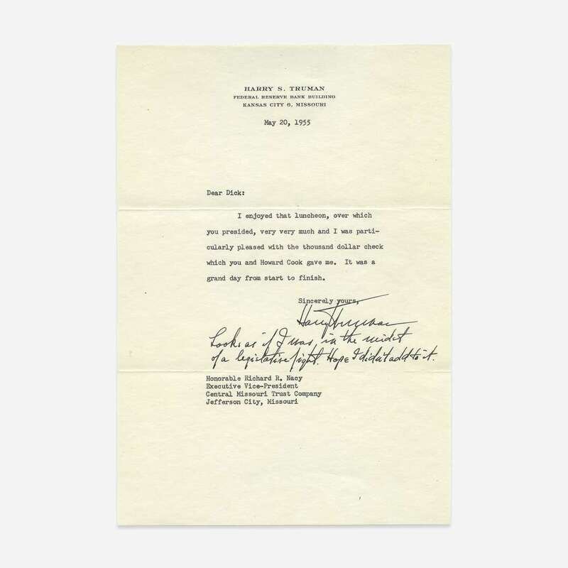 Kansas City, Missouri, May 20, 1955. 1 p. 10 1/2 x 7 1/4 in. (266 x 184 mm). Typed letter, signed by Truman, to Richard R. Nacy, Executive Vice-President of the Central Missouri Trust Company; additional MS. postscript by Truman beneath his signature; on Federal Reserve Bank Building stationery. Lot includes an engraved portrait of Truman.