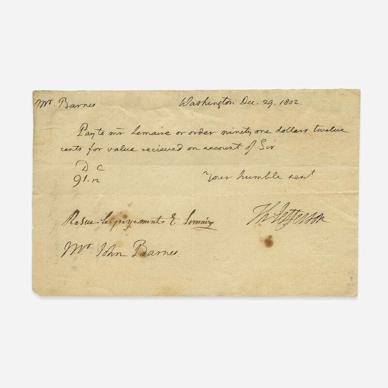 Washington (D.C.), December 29, 1802. 4 7/8 x 7 3/4 in. (123 x 196 mm). Autograph document, signed by Thomas Jefferson as President, ordering his business advisor John Barnes to pay É(tienne). Lemaire, staff member in the President's House (The White House), the sum of $91.12; docketed by Lemaire, in French, at bottom; docketed on verso. Creasing from original folds; some spotting at bottom; residue from previous mounting along top edge verso. Lot includes a tobacco card of Jefferson.
