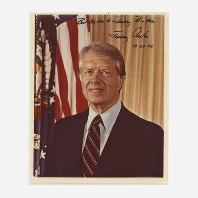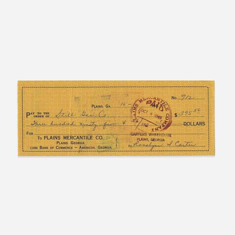 Signed Photograph No place, December 20, 1982. Glossy color photographic portrait, inscribed by President Carter: "Best Wishes to Jimmy Britton/Jimmy Carter/12-20-82". 10 x 8 in. (254 x 203 mm). Together with: Signed Check Plains, Georgia, October 8, 1960. 3 1/4 x 8 3/8 in. (82 x 212 mm). Partially printed Plain Mercantile Co. check, signed by future First Lady Rosalynn Carter, made payable to Still Gas Co. for $395. 56; ink stamps on recto and verso.