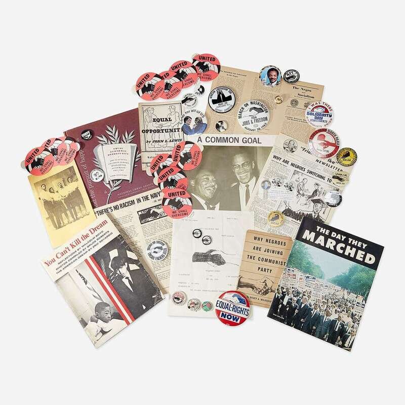 Various places, ca. 1940-81. 49 pieces. Includes a rare mimeographed poster for the "1st Annual Inter Collegiate SNCC Party A-Go-Go", held in Chicago on May 28, 1965; "Friends of Ike" newsletter, membership card, and two buttons; a copy of "Equal Opportunity" by John L. Lewis--his speech at the National Negro Congress, April, 1940; "United We Shall Overcome" stickers; numerous buttons from the 1963 March on Washington, various rallies, for various unions, etc.; various publications. Condition varies.