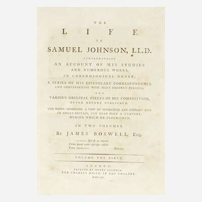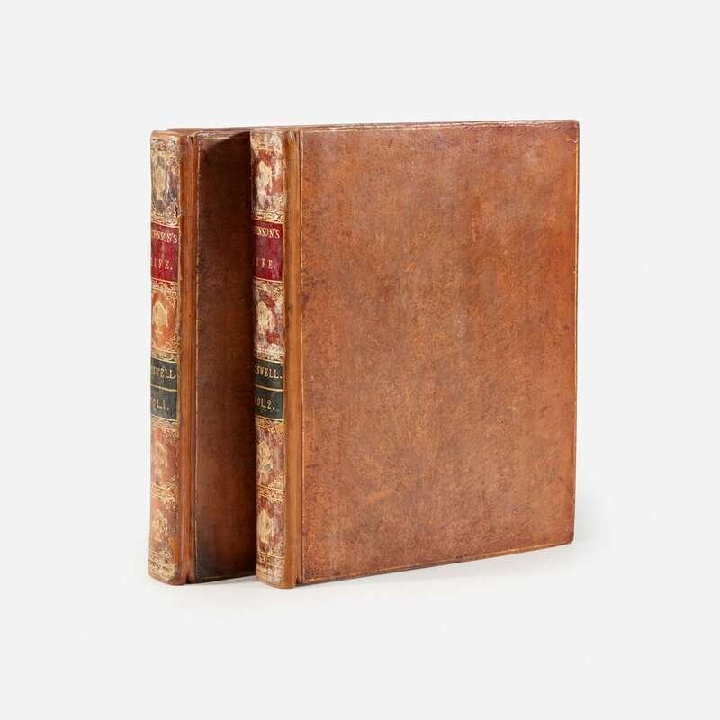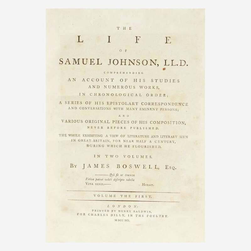 London: Printed by Henry Baldwin, 1791. In two volumes. First edition, second state (with "give" on line 10, p. 135, in first volume). 4to. xii, (16), 516; (ii), 586 pp. Illustrated with an engraved portrait of Johnson in first volume, and two plates in second volume. Contemporary full tree calf, stamped in gilt, red and black morocco spine labels, each volume rebacked with original spine laid down, extremities lightly worn; all edges trimmed; frontispiece foxed; first volume lightly foxed, 3 3/4 in. repaired closed tear at bottom of pp. 141/142 in same; second volume lightly foxed, with heavier foxing on pp. 301-304, circular stain at bottom fore-edge of pp. 486-487 in same.