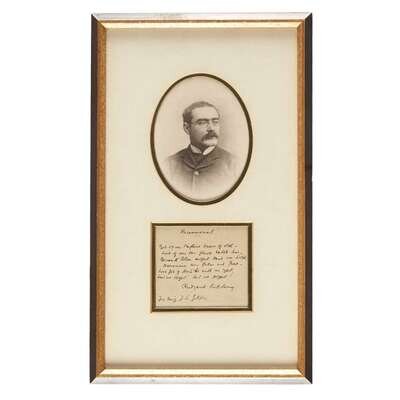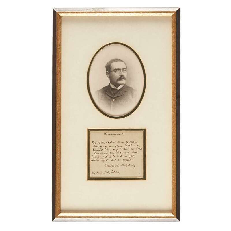 No place, no date. MS. on one sheet of wove paper (3 1/8 x 3 3/4 in.; sight): "Recessional./God of our Fathers known of old--/Lord of our far-flung battle-line--/Beneath whose awful Hand we hold/Dominion over Palm and Pine--/Lord God of Hosts, be with us yet,/Lest we forget! Lest we forget!/Rudyard Kipling/For Miss J. L. Gilder". Very lightly foxed and with one faint crease. Mounted and framed with a photographic portrait of Kipling, 15 x 9 in. (381 x 228 mm).