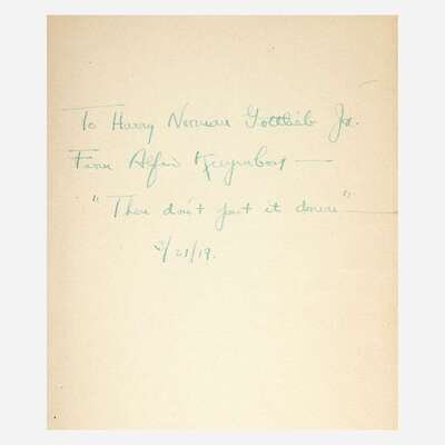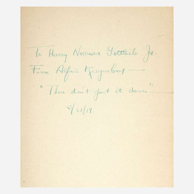 New York: John Marshall Co., Ltd., 1916. First edition. 8vo. (xvi), 142, (2) pp. Inscribed by Kreymborg on front free endpaper: "To Harry Norman Gottlieb Jr./From Alfred Kreymborg/'Then don't jot it down'/3/21/19". Illustrated tan boards, stamped in black, scattered wear to boards, unevenly toned; all edges trimmed; text lightly toned. Uncommon inscribed.