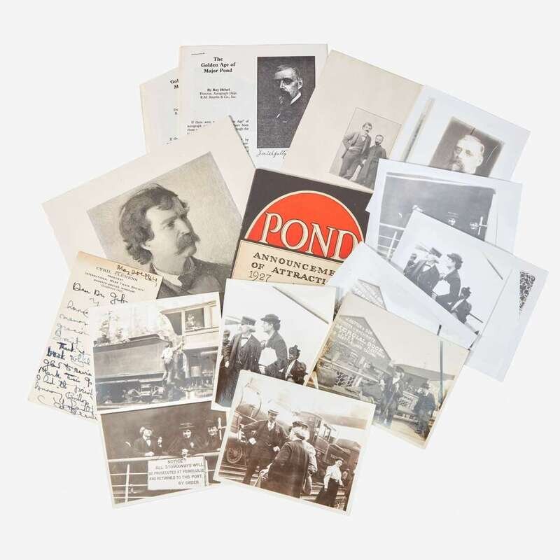 Locations vary, August, 1895. Five unpublished photographs of Mark Twain (Samuel Langhorne Clemens), on board a few different ships, as well as on and around an engine of the Great Northern Railway, all taken at different points along the West Coast of the United States; each 4 5/8 x 3 5/8 in. (117 x 92 mm). The photos were taken during a tour organized by Major James Pond who arranged a worldwide lecture tour for the then broke Clemens. Also seen are Clemens's wife and their daughter, Clara. The lot also includes an A.L.s. by Cyril Clemens, president of the International Mark Twain Society and a distant cousin of the author; later copies of some of the photos; assorted printed ephemera.