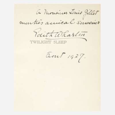 New York and London: D. Appleton and Company, 1927. First edition, first printing. 8vo. (iv), (373), (1), (3) (ads) pp. Association copy, inscribed by Edith Wharton on half-title to her friend and translator, Louis Gillet. Original full purple cloth, stamped in gilt; all edges trimmed; illustrated endpapers; text leaves lightly toned; in original worn dust-jacket, front panel detached, front flap starting, spine ends chipped, other chips along top and bottom edges. Garrison A 41.1.a.