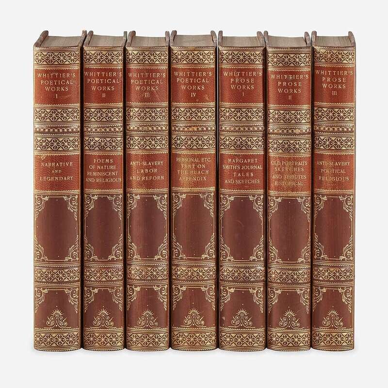 Boston and New York: Houghton, Mifflin and Company, 1891-92. In seven volumes (four volumes of Poetical Works, and three volumes of Prose Works). Riverside Edition. 8vo. Illustrated with frontispiece in each volume of Poetical Works and first volume of Prose Works. Three-quarter brown calf, stamped in blind and in gilt, brown morocco spine labels, over marbled paper-covered boards; top edges gilt, other edges trimmed; matching marbled endpapers. A handsome set.