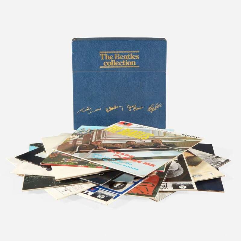 Parlophone, 1984. 13-LP set in its original blue leatherette box, stamped in gold, including facsimile signatures of all four Beatles. Records appear unplayed and include all original posters and inserts. Box shows signs of wear. A must-have for any vinyl Beatles fan in 2020!.
