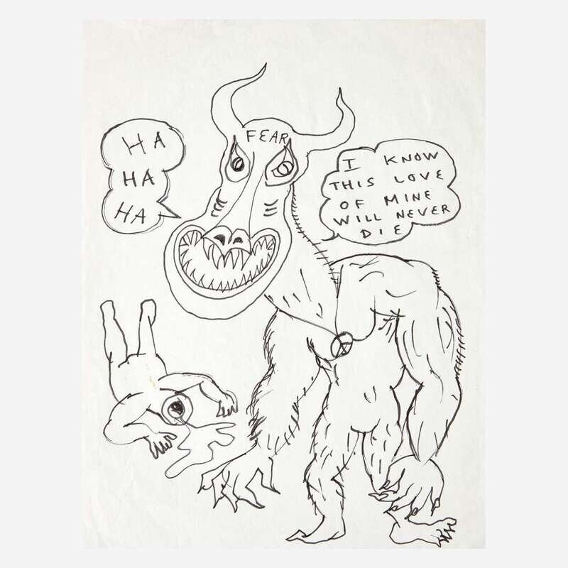 "I Know This Love of Mine Will Never Die" No date (ca. 1980s-90s). Ink on paper. Light creasing at corners; minor stain at bottom left. 11 x 8 1/2 in. (279 x 215 mm). Together with: "Whats Going On?" No date (ca. 1980s-90s). Green ink on paper. Signed by Johnston, bottom right. Scattered creasing; light soiling along top edge; small short closed tear at top right edge. 11 x 8 1/2 in. (279 x 215 mm).