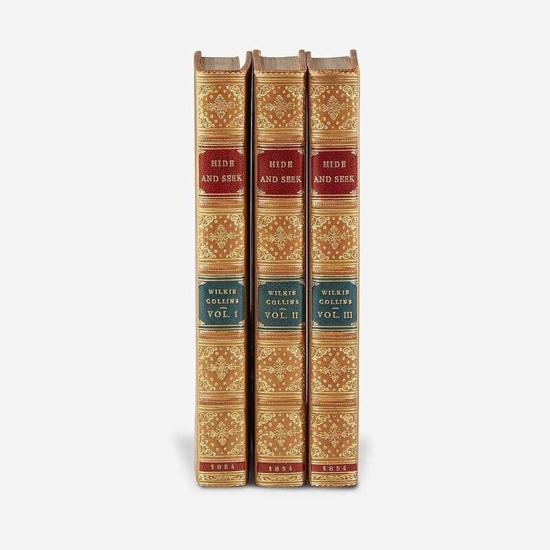 London: Richard Bentley, 1854. In three volumes. First edition. 8vo. viii, 297; (iv), 322; (iv), 332 pp. Lacking ads at rear of first and second volumes. Full polished tan calf, decoratively stamped in gilt, red and green morocco spine labels, front board of first volume lightly scuffed; top edges gilt, other edges trimmed; gilt dentelles, marbled endpapers; by Riviere; original cloth covers bound in at rear of each volume; small private library label on recto of rear free endpaper in each volume; scattered minor edge wear; scattered soiling to text in third volume, circular stain on pp. 134-135 in same; in cloth-covered slip case.