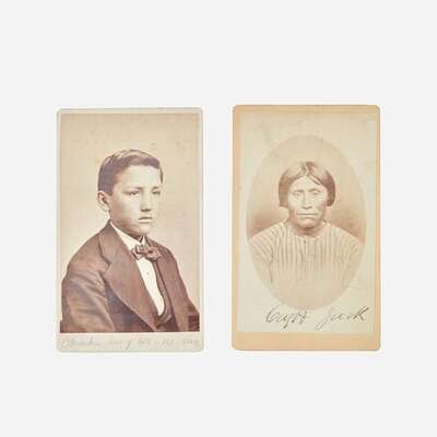 Circa 1870s. Two carte de visites of Modoc tribe chief Kintpuash (Captain Jack) and Charka (Jefferson C. Davis Riddle), son of Winema (Toby Riddle). From the studios of R.A. Lewis, New York, and Isaac White, Hartford, Connecticut. Both cards titled at bottom. Each 4 1/4 x 2 1/2 in. (107 x 63 mm).