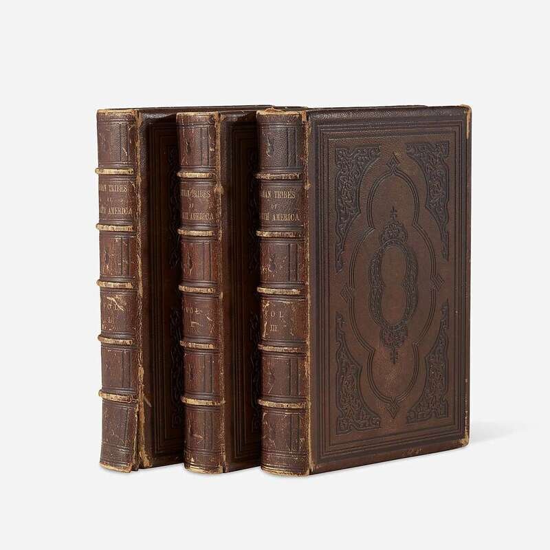 Philadelphia: D. Rice & A.N. Hart, 1858. In three volumes. Fourth Philadelphia octavo edition. Royal 8vo. Illustrated with hand-colored lithographic frontispieces in each volume, and 117 hand-colored lithographic plates throughout the set. Publisher's full brown leather, stamped in blind and in gilt, slightly rubbed, extremities rubbed and slightly worn; all edges gilt; text block of first volume separated from binding; scattered light to moderate foxing in each volume. Howes M129; Sabin 43411.