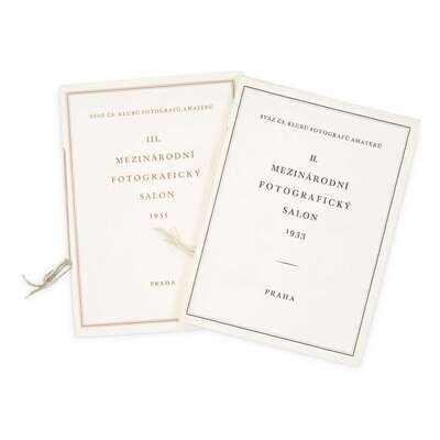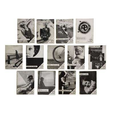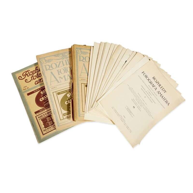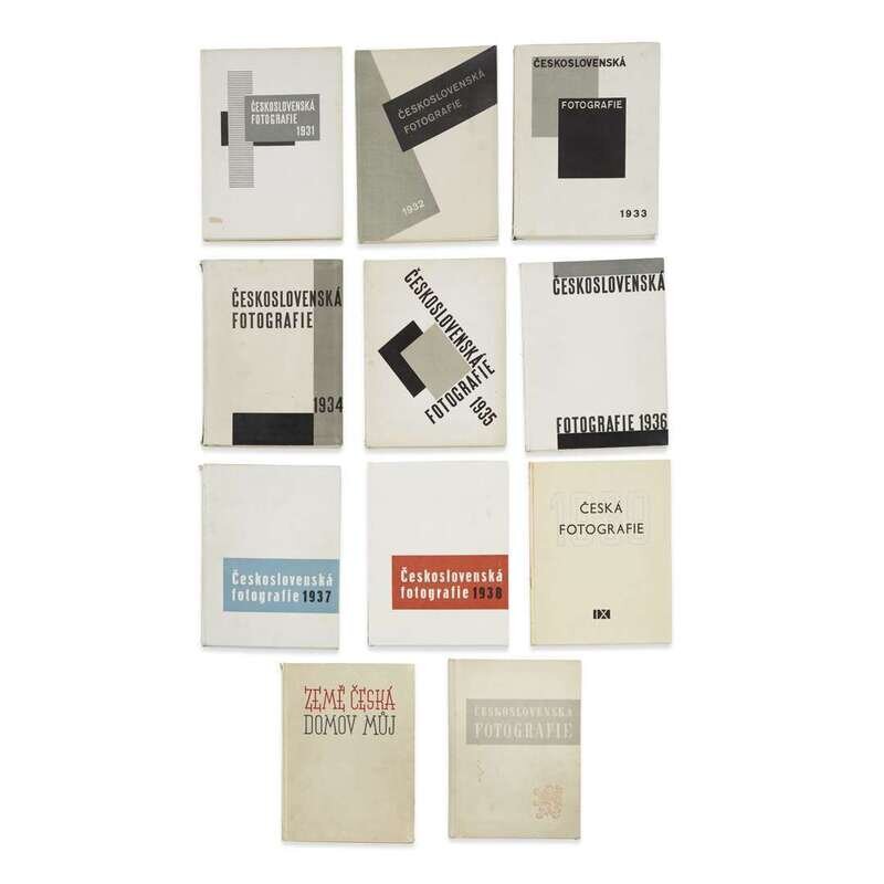1. Ceskoslovenská Fotografie Prague: Fotograficky Obzor/Svaz Ceskoslovenská Klubu Fotografu Amatéru, 1931-40, 1946. Eleven volumes of the complete run of 13 (lacking the supplementary volumes of 1941 and 1949). 4to. 64 pp. each, with varying pages of ads in rear. First through eighth volumes bound in white cloth-covered boards stamped in red, grey, blue, and black; ninth through eleventh volumes bound in off-white paper-covered boards stamped in red, grey, blue, and black. Publication ceased during Nazi occupation, but an additional three volumes were published after World War II. Covers of first eight volumes designed by Karl Teige. 2. Fotorádce Prague: E. Beaufort, Podniky Grafické a Nakladatelské, undated (ca. 1940s-1950s). 13 issues (1-5, 7-13, 17) of this Czech photography series. Stiff photographic wrappers, some pencil notations and stamps on wrappers and title-pages. Text with black-and-white photographs and the occasional line drawing. 3. Hák, Miroslav Ocima: svet kolem nás Prague: Ceskoslovenské filmové nakladatelství, 1947. First edition. Square 8vo. 15 pp. of text, with 45 sheet-fed gravures. Stiff photographic wrappers. Miroslav Hák worked as the photographer for the theater group D34, for the Czech film industry, and in the 1940s was part of the avant-garde Group 42. (Heiting, 302). 4. Vilém Heckel Prague: Panorama, 1981. First edition. Text by Petr Teusk. 4to. Stiff photographic portfolio, rear fold separating; containing 18 loose bromoil prints; with 28 pp. of text in, stapled self wrappers. 5. Jenícek, Jicí (photographer) and Ladislav Sutnar (designer) Dvacet let ceskoslovenské armády v osvobozeném state Prague: for the Interior Ministry, 1938. 4to. 243 pp. Quarter white pigskin, stamped in gilt, over orange cloth-covered boards; black endpapers; photographic dust-jacket, variously chipped and torn, with tape repairs. Dvacet let ceskoslovenské armády v osvobozeném státe [Twenty Years of the Czechoslovakian Army in the Liberated State] was designed by Ladislav Sutnar with 72 black-and-white photographs by Jicí Jenícek, and produced by the Interior Ministry in pre-war Czechloslovakia. 6. Mezinárodní Fotografický Salon Prague: Svac Cs. Klubu Fotografu Amatéru, 1933, 1935. 8vo. In two volumes. Unpaginated. Stiff printed wrappers. Illustrated catalogues for the second and third international photography exhibitions organized by the Club of Amateur Photographers in Prague. Rare. 7. Vilém Reichmann Prague: Pressfoto, 1984. First edition. Text by Alena Šlachtová. 4to. Stiff photographic portfolio; containing 13 loose halftone prints (duplicate of image #1); with 14 pp. of text, stapled self wrappers. Volume 8 of the International Photography Editions series. 8. Rozhledy Fotografa Amatéra Prague: Rozhledy Fotografa Amatéra, 1926-29. 46 issues, plus index. Limp wrappers, printed in black, red, brown, and blue, several with front cover detached; contains text, reproductions of photographs, and ads. A near-complete run for the years 1926-29 (missing first issue of 1927). 9. Tmej, Zdenek (Czech, 1920-2004) Abeceda: Duševního Prázdna Prague: Nakladatelství Zádruha, 1946. First edition. 4to. Unpaginated. Illustrated with photogravures. Stiff wrappers, variously chipped; rubber stamps to recto of first free leaf and copyright page, possibly ex-library; dust-jacket wanting. Photographs by Zdenk Tmej with text by Alexandra Urbanová. Tmej's "Alphabet of Spiritual Emptiness" largely consists of photos surreptitiously taken at Breslau in 1942 while forced to work for the Nazi war effort. (Roth, p.124.). 10. [Toyen] (designer) Matka: Povídky a medailony Prague: Rudolf Kmoch, 1943. 8vo. 175 pp. With frontispiece by Toyen. Quarter cloth over decorated paper-covered boards; photographic dust-jacket also designed by Toyen. With André Breton's help, the painter Toyen (1902-1980) helped make Prague a significant center for Surrealist activity. Born Marie Cermínová, he adopted the name Toyen, dressed in men's clothes, and used masculine pronouns.