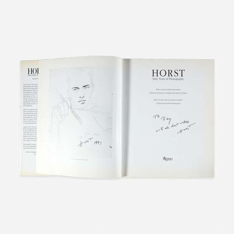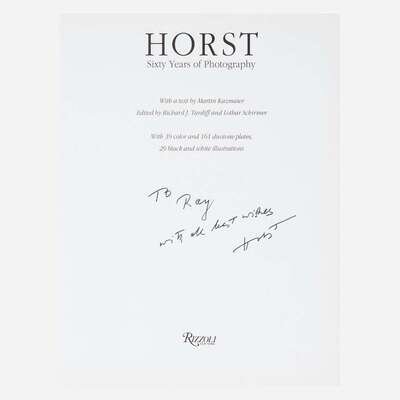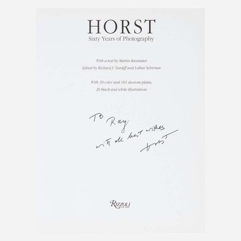 New York: Rizzoli, (1991). First edition. 4to. Inscribed by Horst on title-page: "To/Ray/with all best wishes/Horst"; and signed four additional times: on frontispiece, and on plates for Joan Crawford, Noel Coward, and Katharine Hepburn. Profusely illustrated. Original black cloth, stamped in silver; all edges trimmed; in original pictorial dust-jacket.